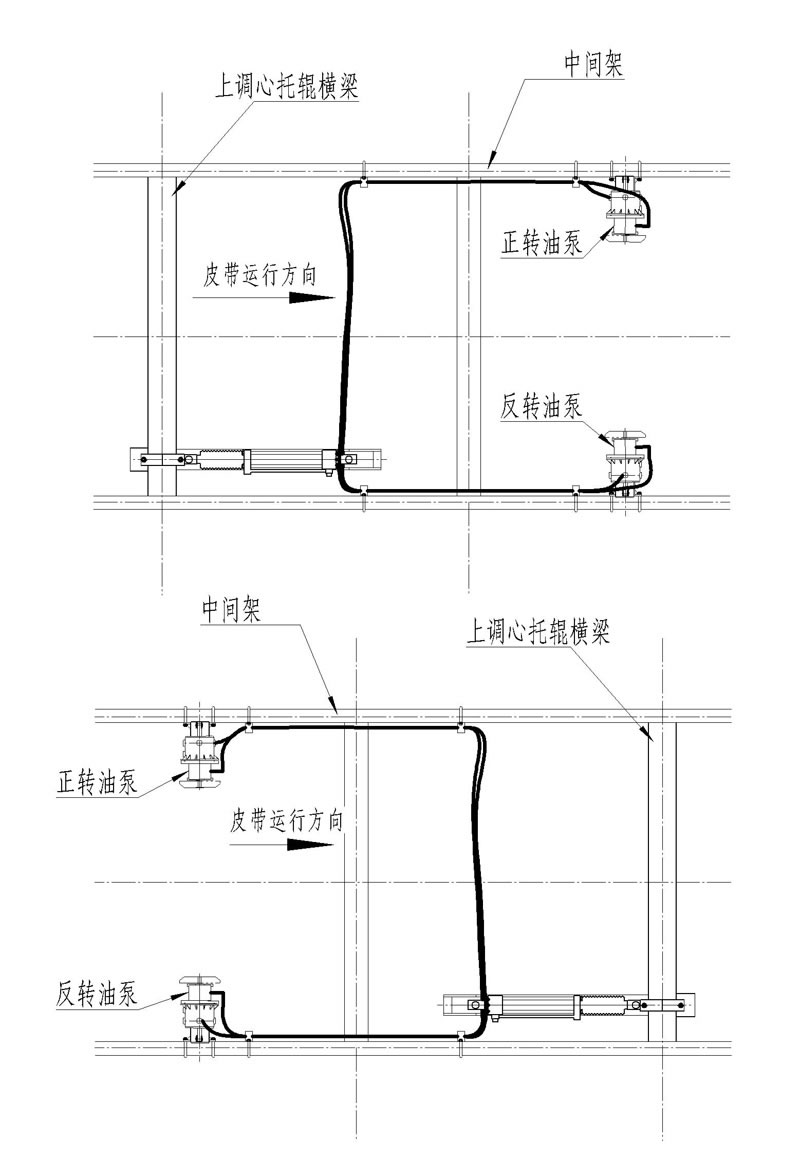 全部安裝完成后,模擬皮帶跑偏,輪流盤動(dòng)左右檢驅(qū)輪,讓油缸帶動(dòng)調(diào)心托輥旋轉(zhuǎn),循環(huán)5次。