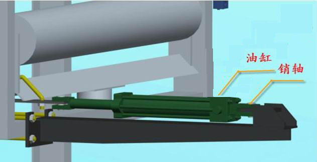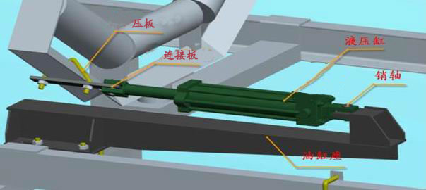 ③ 把液壓缸的兩個(gè)耳環(huán)孔分別按照如圖所示的位置用銷軸裝在活塞桿卡子和油缸座上。