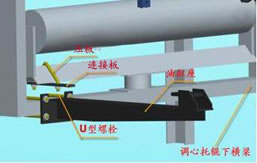 ①把活塞桿卡子如圖所示安裝在下調(diào)心托輥橫梁上,先不擰緊螺母,待油缸安裝上調(diào)整到合適位置時(shí)再擰緊螺母。