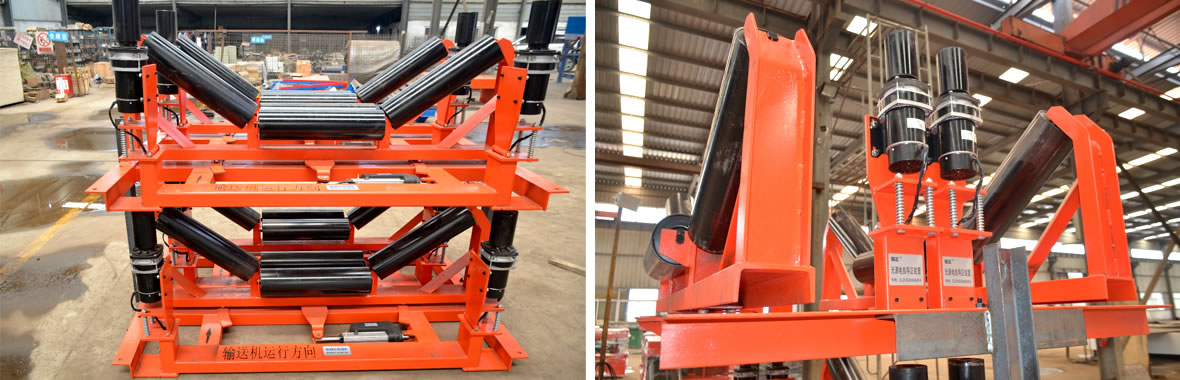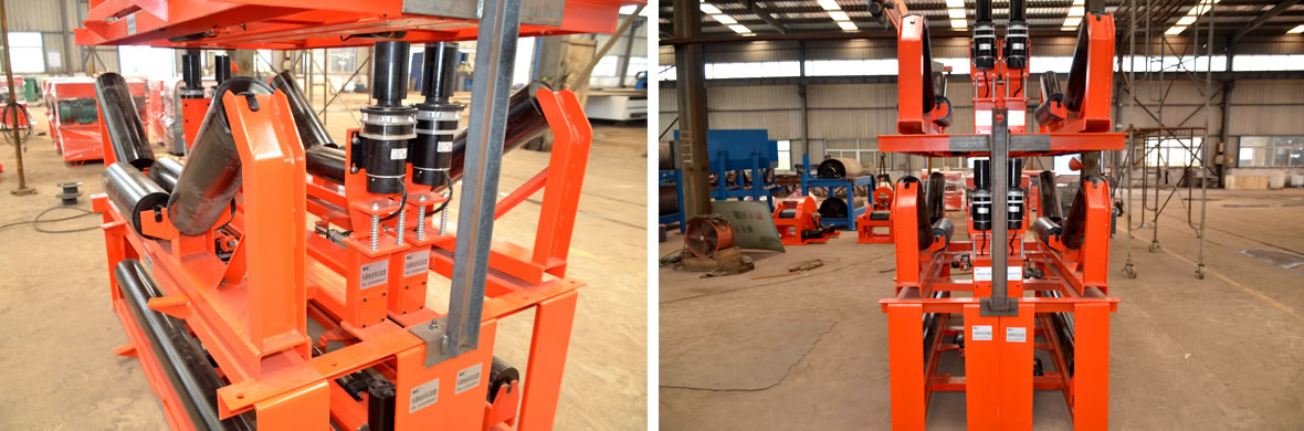 根據皮帶機的現場條件及使用特點,皮帶機由于溫度過低張力不穩、托輥竄動、托輥粘料、托輥卡死,物料偏載,沖水等原因,經常出現皮帶跑偏現象。選擇在輸煤皮帶機頭部、尾部承載段安裝2套,每套智能自動導正裝置可以保障50m輸送機良好運行;導正性的平衡調整皮帶的運行中出現跑偏的現象,并避開皮帶秤稱重域安裝,加強皮帶機穩定運行對計量的保障作用。